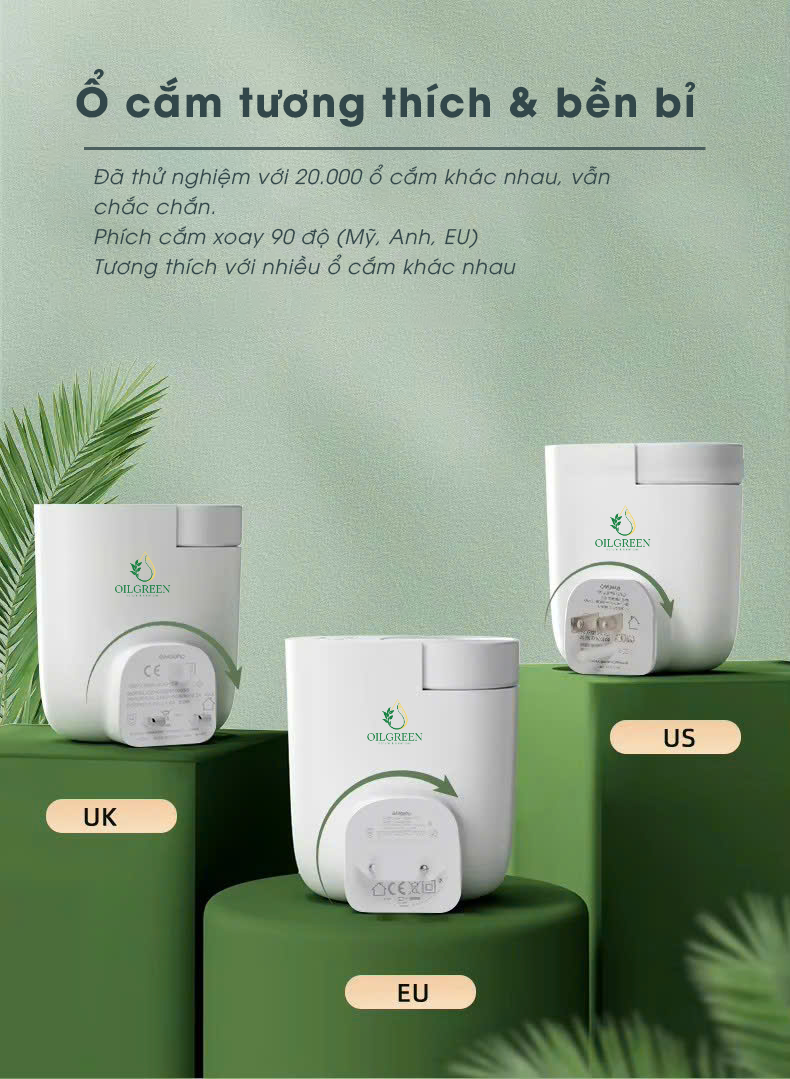 Máy khuếch tán được thiết kế thông minh, dễ dàng sử dụng với nhiều loại ổ cắm thông dụng. Chỉ cần cắm điện là hoạt động ngay, tiện lợi cho cả gia đình, văn phòng hay cửa hàng mà không lo kén ổ cắm.