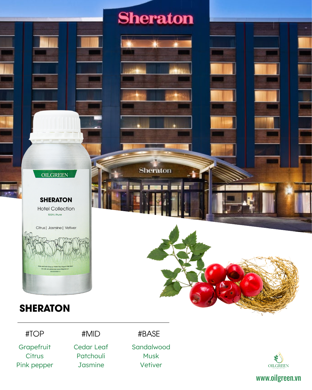 Sheraton mở đầu bằng sự bùng nổ của bưởi chùm, cam chanh và hồng tiêu, tràn đầy sinh lực và tươi mát. Lớp hương giữa hòa quyện của lá tuyết tùng, hoắc hương và nhài tạo cảm giác thanh lịch, thư thái. Khép lại là tầng hương gỗ đàn hương, xạ hương và cỏ hương bài ấm áp, đọng lại dấu ấn sang trọng và đẳng cấp, như bản hòa ca hương thơm của một khách sạn 5 sao.